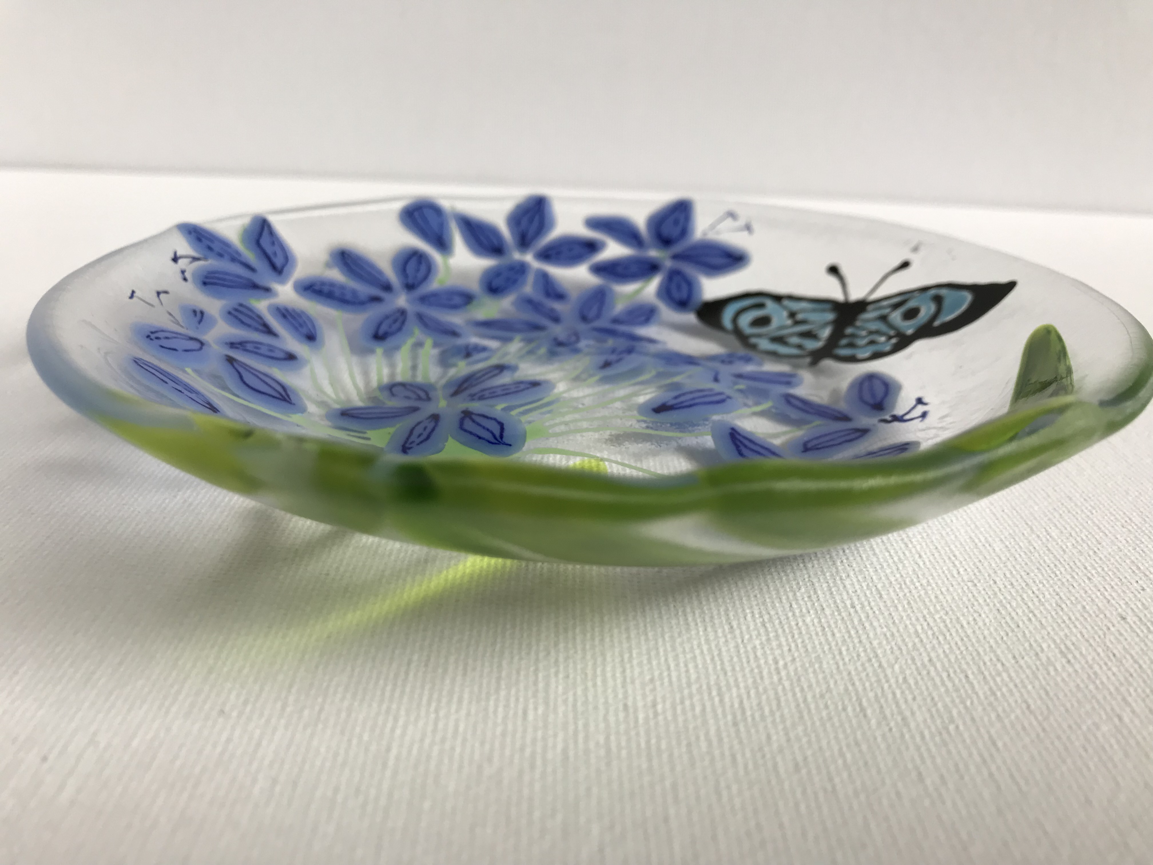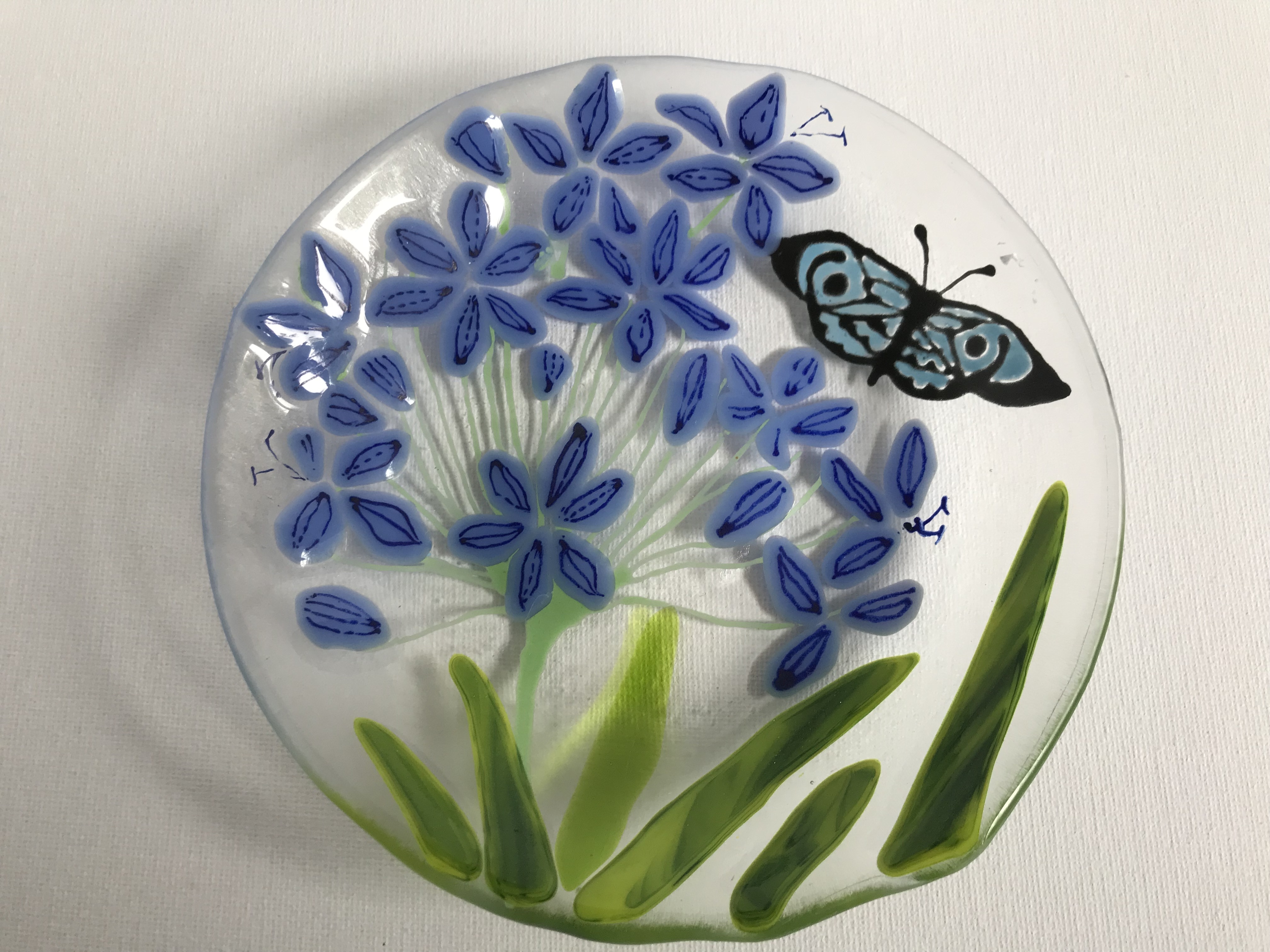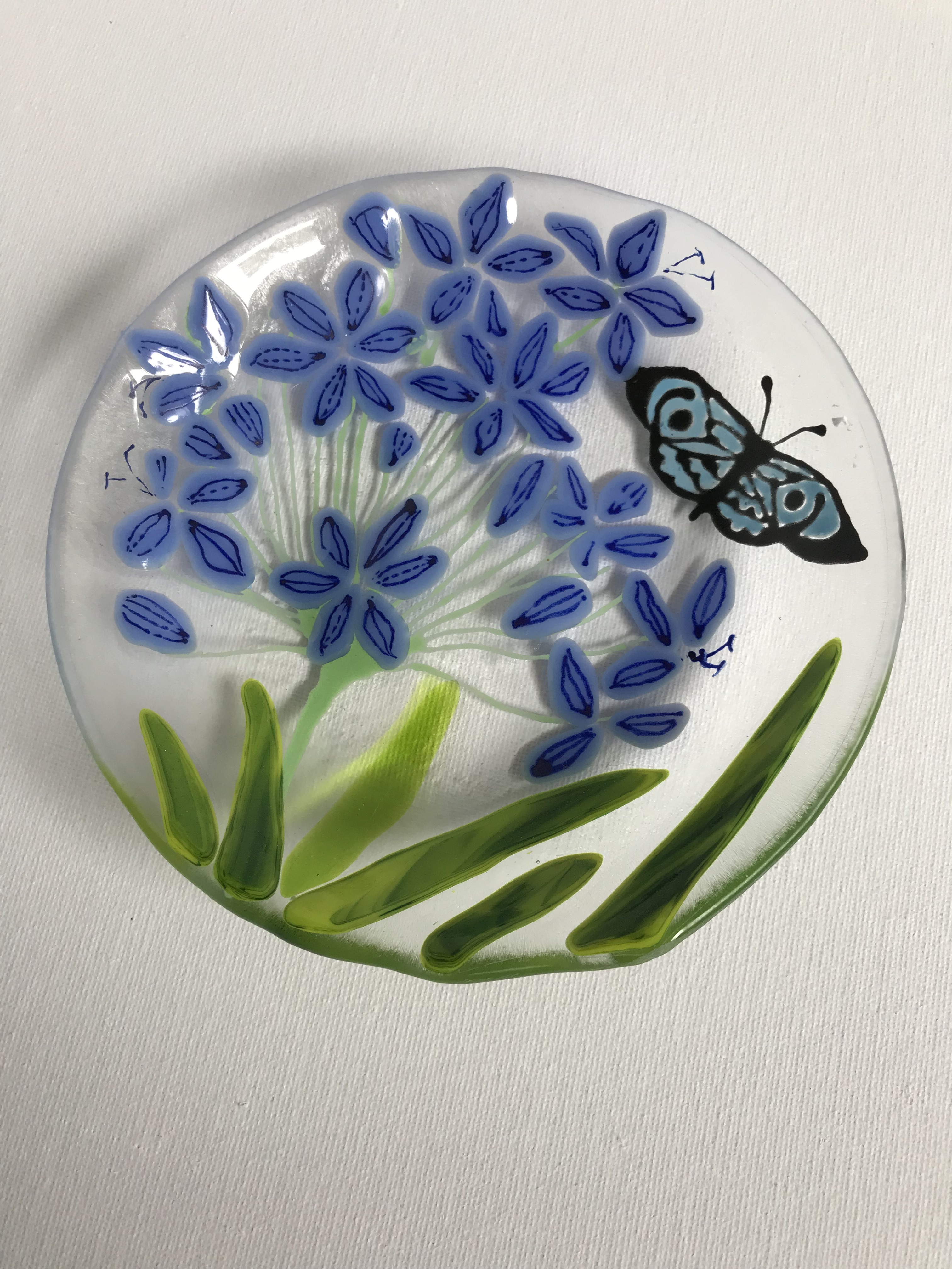 This little dish is 20cm in diameter. It has a glass agapanthus and a glass painted butterfly fused into its surface.