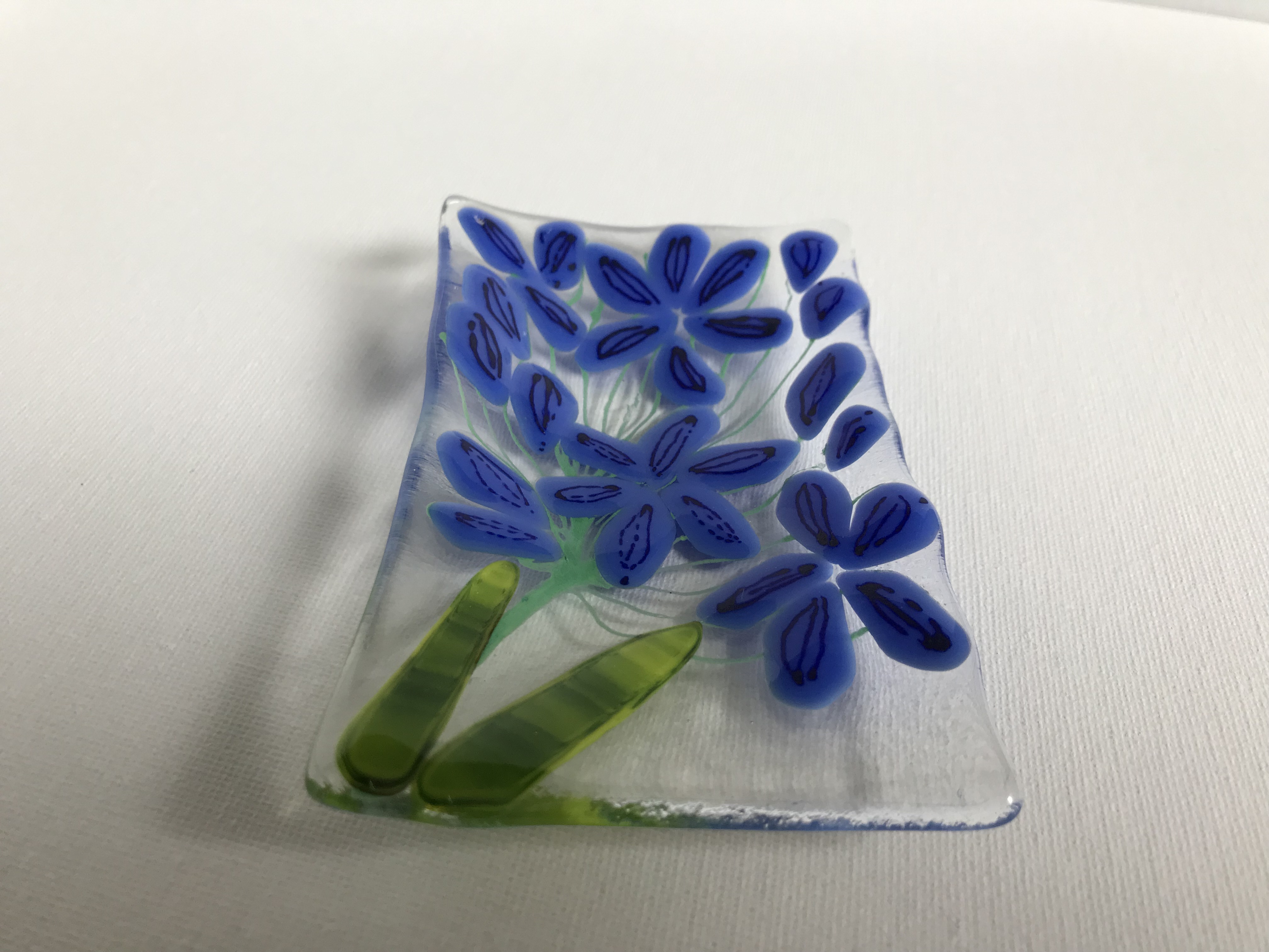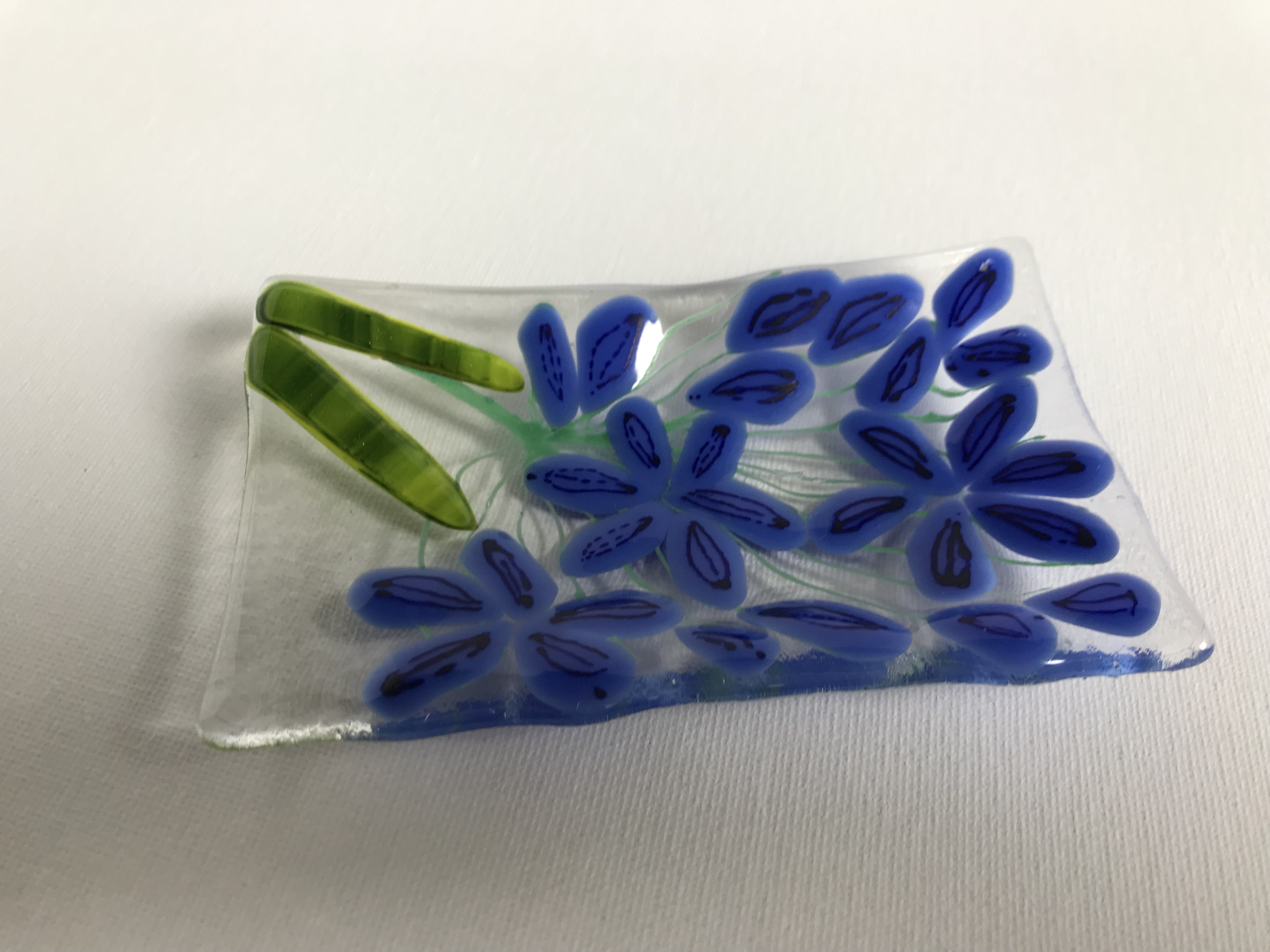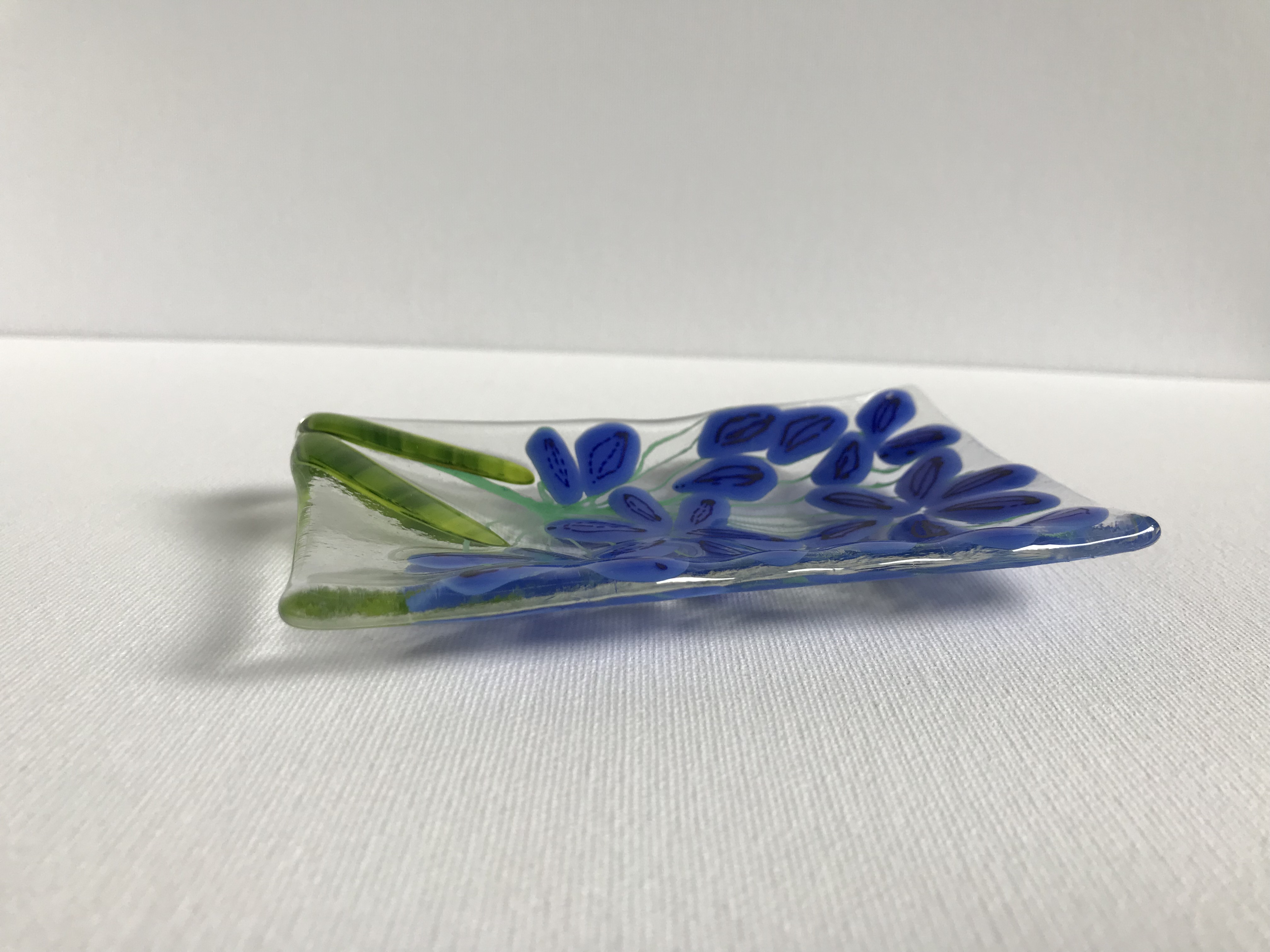 This dish is quite shallow and measures 13cm by 8cm. It is made with blue periwinkle glass and has the detail fused in in glass paint.
