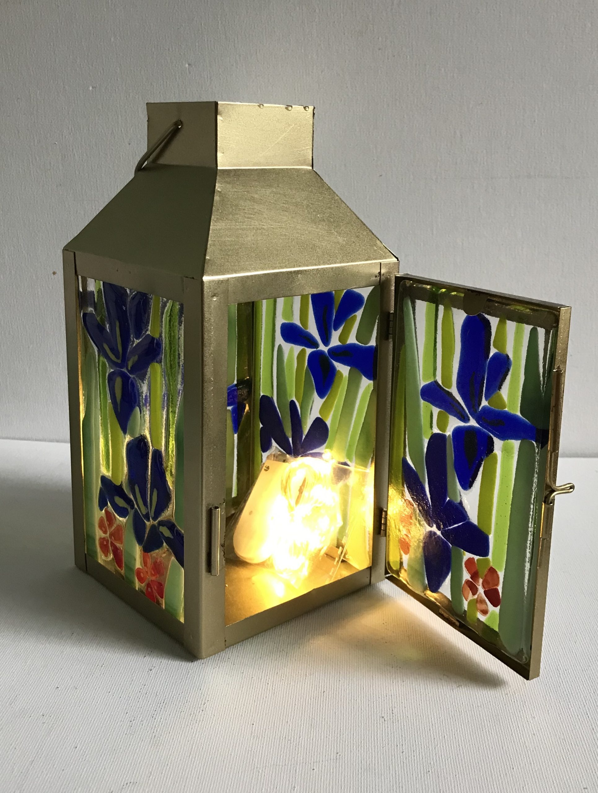 This lantern has an Iris design. It is a gold coloured metal Lantern that has an overall height of 23cm. The panels measure 12 by 15 1/2 cm. It has a string of LED lights inside.