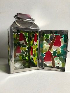 This lantern has panels that measure13cm by 18 1/2 cm. The overall height is 31cm. The robinsĀ and leaves are cut from pieces of coloured glass and fused to a piece of plain glass. There is a string of LED lights inside the lantern.