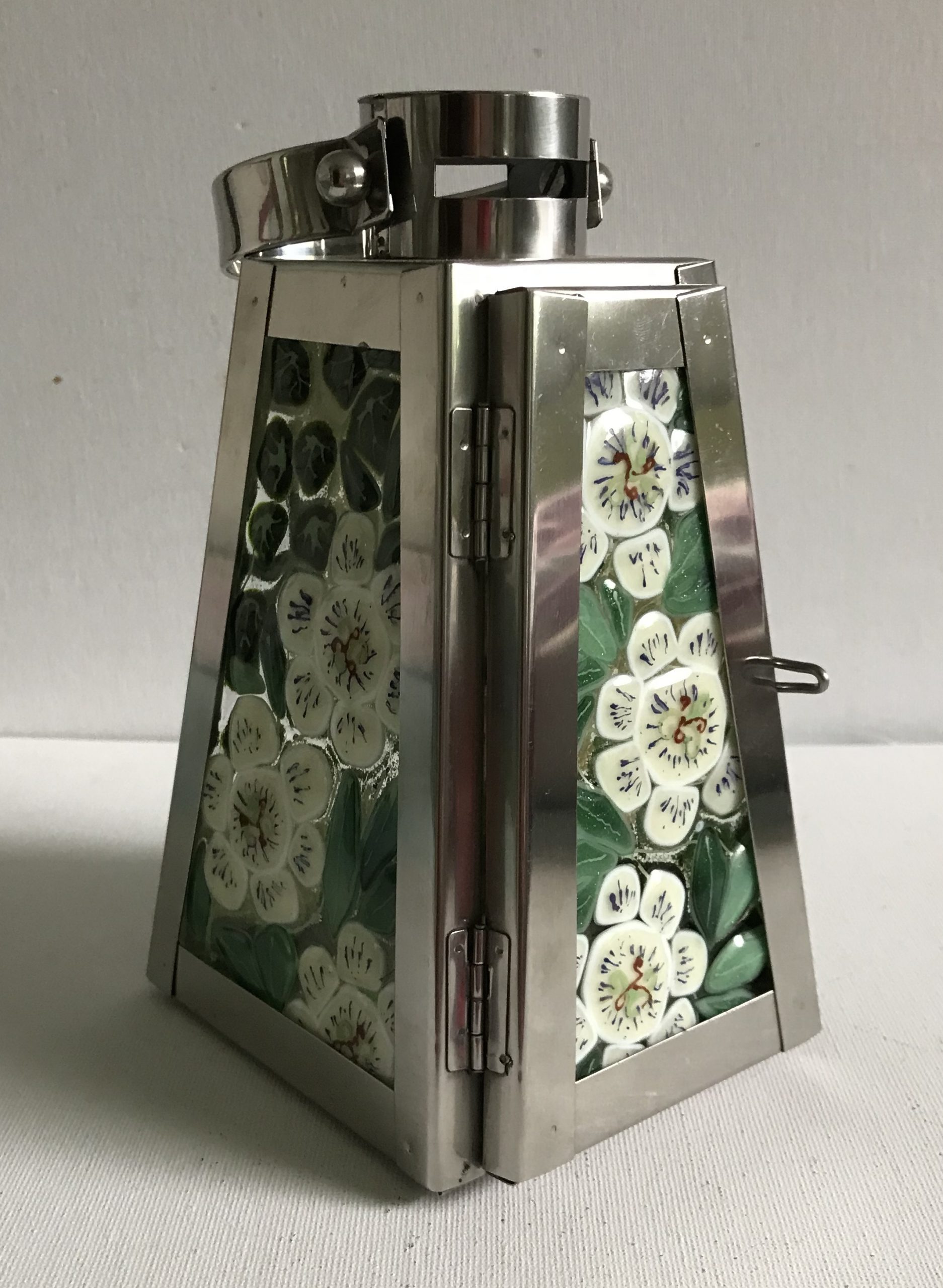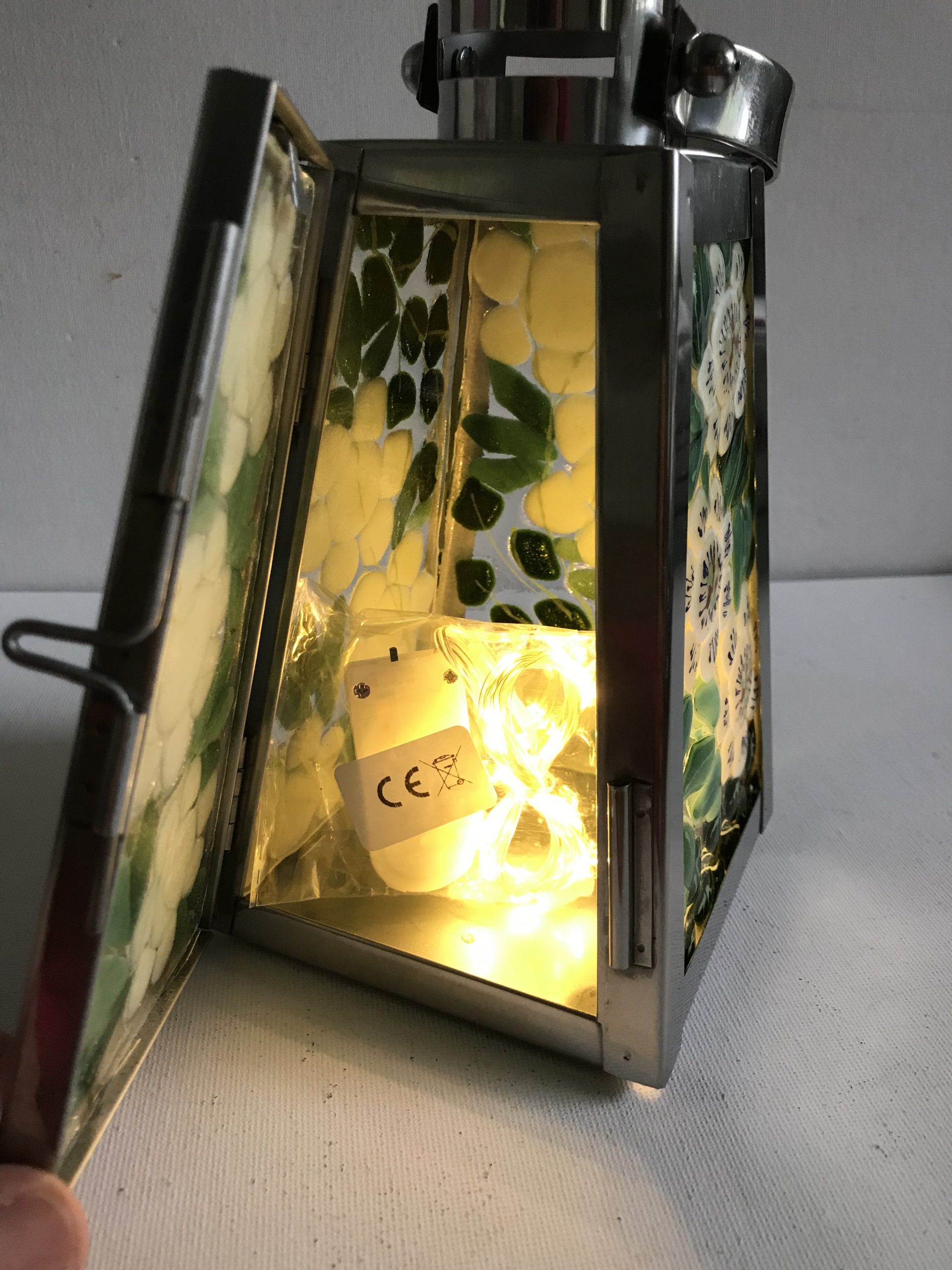 This passionflower Lantern has a height of 23cm. the panels taper from 11 cm to 7 cm. It is stainless steel and has a string of LEDÂ lights inside.