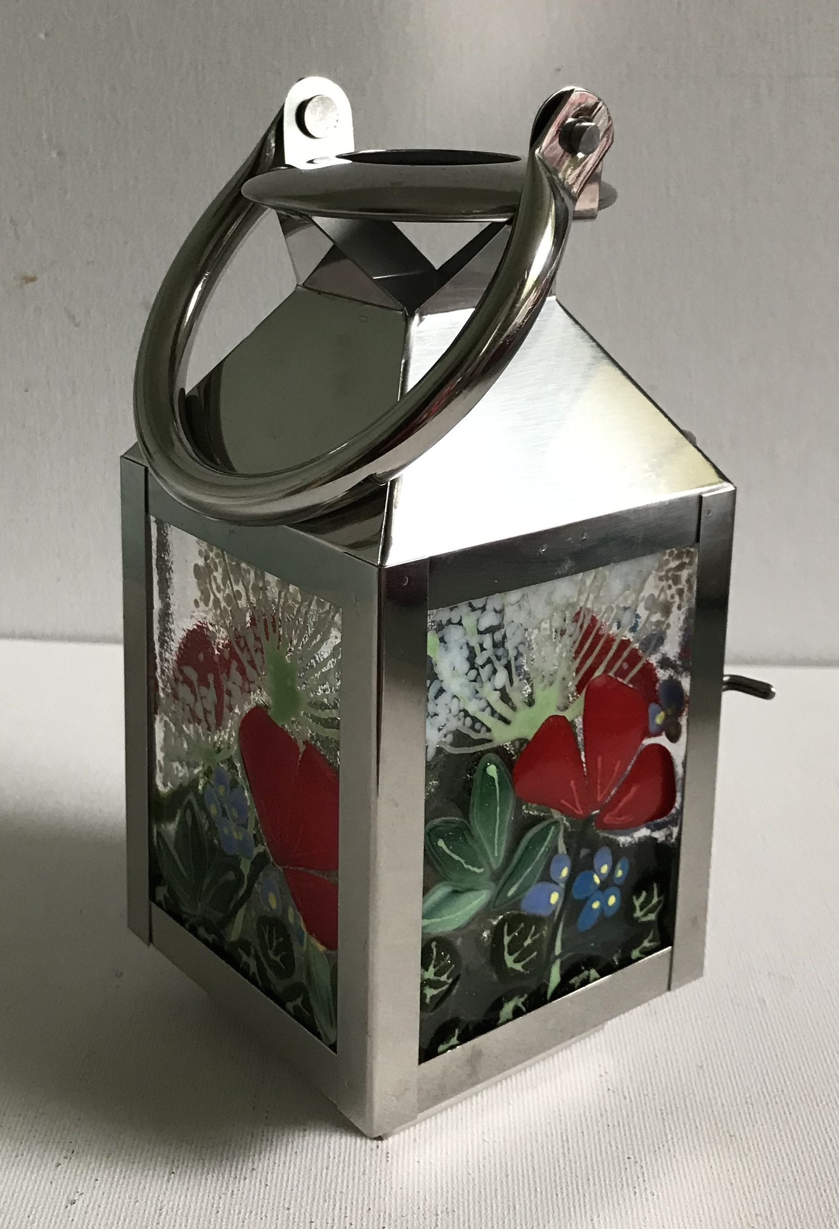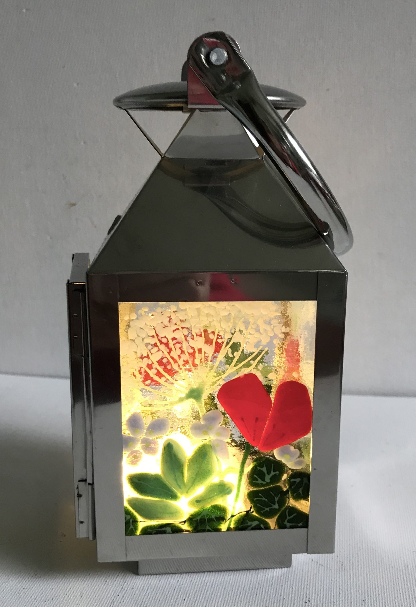 This stainless steel Lantern measures 9 by 10cm on the panels. The overall height is 17cm. It has a string of LED lights inside.