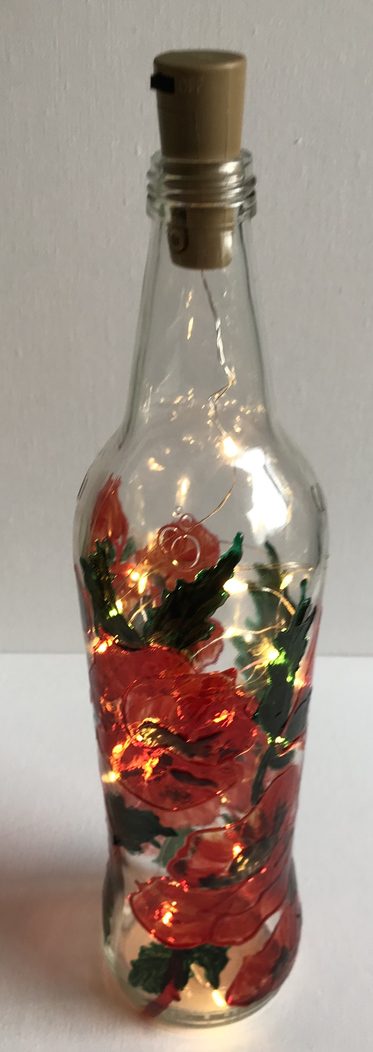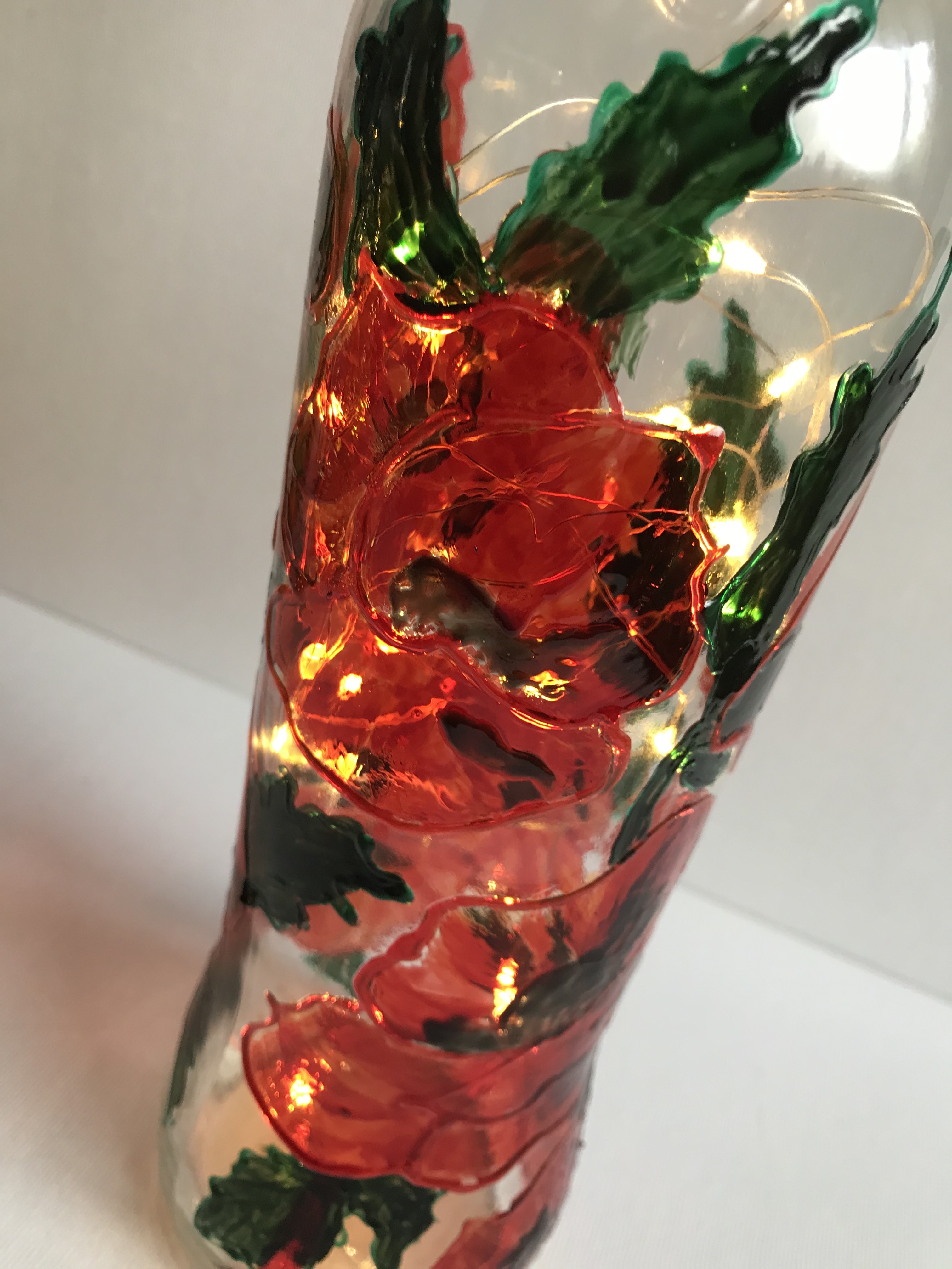 This bottle is painted with large red poppies. It has a string of 20 led lights inside to light it up