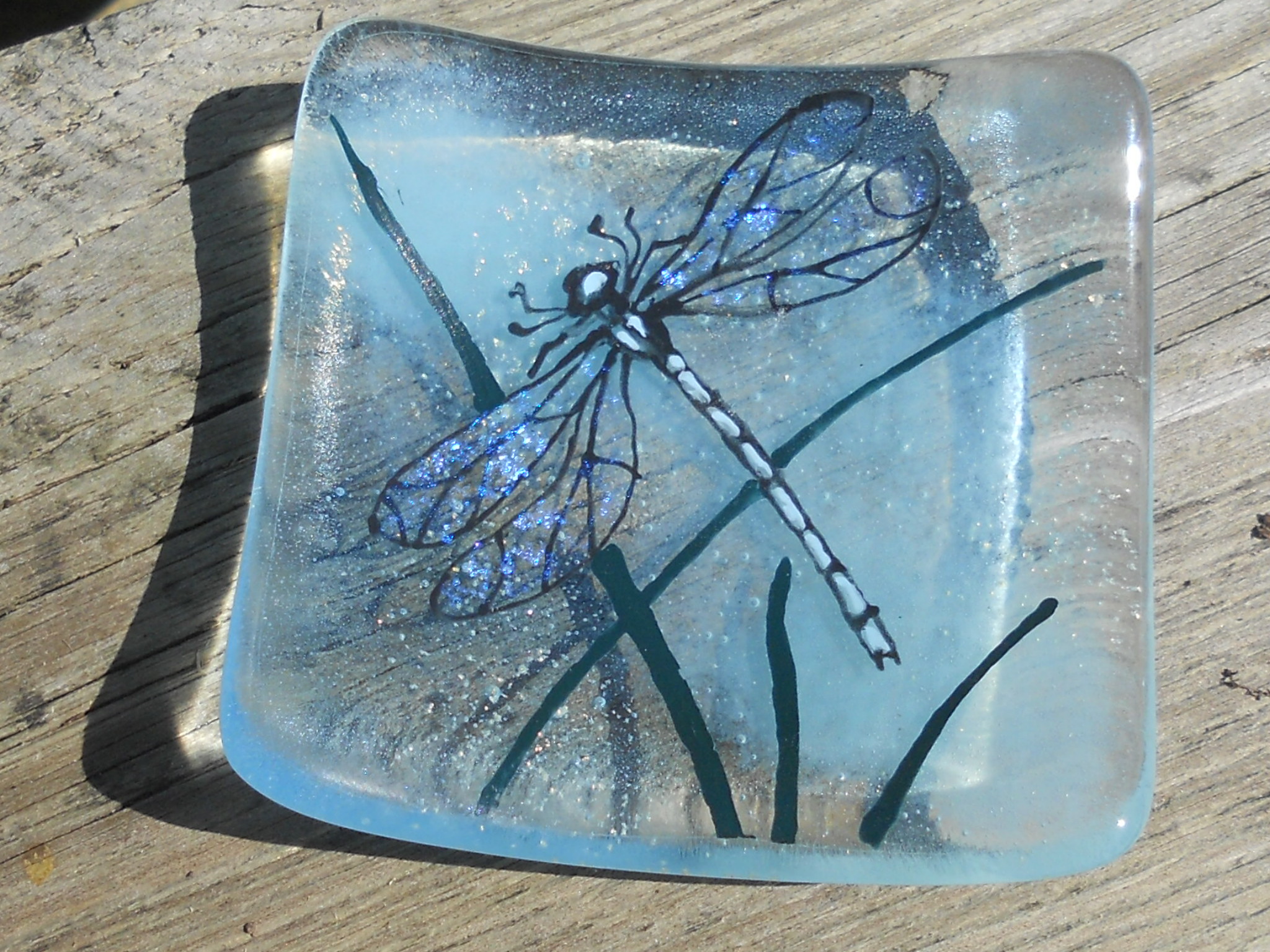 This dragonfly dish measures 10cm by 10cm. The Dragonflies are painted on the glass and fused into into the surface with dichroic glass on the wings.